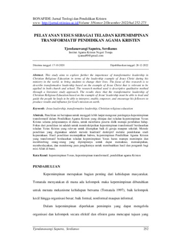 Penelitian ini bertujuan untuk menggali lebih lanjut mengenai pentingnya kepemimpinan transformatif dalam Pendidikan Agama Kristen yang ditinjau dari teladan kepemimpinan Yesus Kristus selama pelayanannya di dunia, untuk membawa peserta didik menuju perubahan hidup. Fokus dari penelitian ini adalah untuk mendeskripsikan kepemimpinan transformatif berdasarkan teladan Yesus Kristus yang relevan untuk diterapkan baik di gereja maupun sekolah. Metode penelitian yang digunakan adalah metode kualitatif deskriptif melalui pendekatan studi kepustakaan. Hasil penelitian menunjukkan bahwa, kepemimpinan Pendidikan Agama Kristen yang transformatif berdasarkan teladan kepemimpinan Yesus harus mampu memimpin dan membimbing orang-orang yang dipimpinnya untuk dapat memaknai, memampukan, memberdayakan, dan mendorong para pengikutnya untuk membuahkan hasil dan pengaruh bagi misi Allah di bumi.