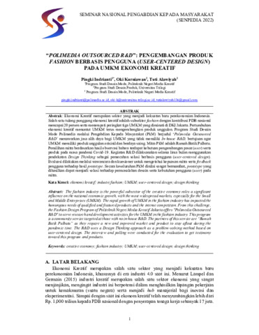 Pingki, Indrianti and Oki, Kurniawan and Tuti, Alawiyah (2022) “Polimedia outsourced R&D”: Pengembangan produk fashion berbasis pengguna (user-centered design) pada UMKM ekonomi kreatif. In: Seminar Nasional Pengabdian Kepada Masyarakat.
