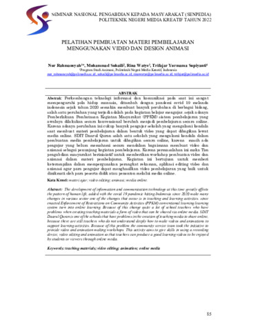 Nur, Rahmansyah and Muhammad, Suhaili and Rina, Watye and Trifajar, Yurmama Supiyanti (2022) Pelatihan pembuatan materi pembelajaran menggunakan video dan design animasi. In: Seminar Nasional Pengabdian Kepada Masyarakat.