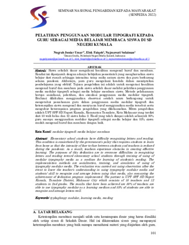 Nugrah, Juniar Umar and Elok, Faiqoh and Najmawati, Sulaiman (2022) Pelatihan penggunaan modular tipografi kepada guru sebagai media belajar membaca siswa di SD Negeri Kumala. In: Seminar Nasional Pengabdian Kepada Masyarakat.