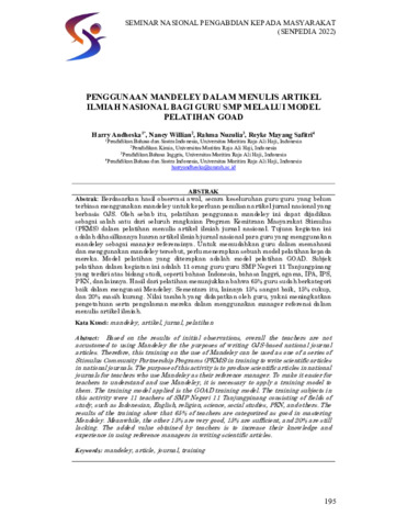 Harry, Andheska and Nancy, Willian and Rahma, Nuzulia and Reyke, Mayang Safitri (2022) Penggunaan Mendeley dalam menulis artikel ilmiah nasional bagi guru SMP melalui model pelatihan goad. In: Seminar Nasional Pengabdian Kepada Masyarakat.