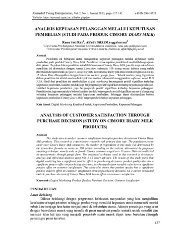 Ranu, Sati Ray and Alfatih, Sikki Manggabarani (2023) Analisis kepuasan pelanggan melalui keputusan pembelian (Studi pada produk Cimory Diary Milk). JYE: Journal of Young Entrepreneurs, 2 (1): 10. pp. 127-142. ISSN 2964-8521