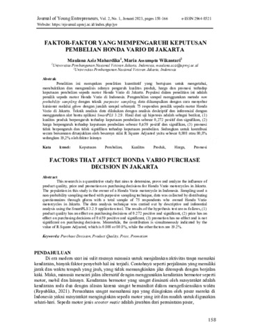Maulana, Aziz Mahardika and Maria, Assumpta Wikantari (2023) Faktor-faktor yang mempengaruhi keputusan pembelian Honda Vario di Jakarta. JYE: Journal of Young Entrepreneurs, 2 (1): 12. pp. 158-166. ISSN 2964-8521