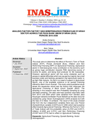 Andre, Armanto and Alvin, Yahya (2022) Analisis faktor-faktor yang mempengaruhi pembiayaan syariah sektor agrikultur pada Bank Umum Syariah (BUS) periode 2015-2020. Indonesia Scientific Journal of Islamic Finance, 1 (1): 2. pp. 22-42. ISSN 2964-5263