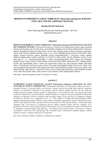 Darlina, Darlina and Siti, Nurhayati (2015) RESPON INTERFERON GAMMA TERHADAP Plasmodium falciparum RADIASI PADA KULTUR SEL LIMFOSIT MANUSIA. Seminar Nasional Keselamatan Kesehatan dan Lingkungan dan Pengembangan Teknologi Nuklir.