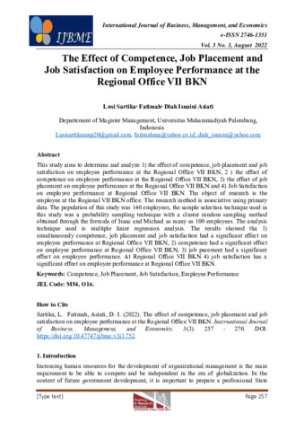 Lusi, Sartika and Fatimah, - and Diah, Isnaini Asiati (2022) The Effect of competence, job placement and job satisfaction on employee performance at the regional office VII BKN. International Journal of Business, Management, and Economics, 3 (3). pp. 257-270. ISSN 2746-1351