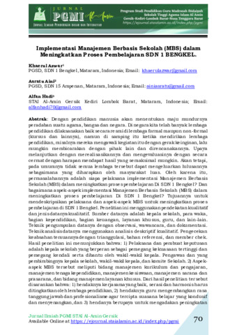 Khaerul, Azwar and Asratu, Aini and Alfan, Hadi (2022) Implementasi Manajemen Berbasis Sekolah (MBS) dalam meningkatkan proses pembelajaran SDN 1 Bengkel. Jurnal Pendidikan Guru Madrasah Ibtidaiyah Al-Amin, 1 (2): 1. pp. 70-82. ISSN 2986-0946