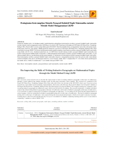 Samiwahyuni, Samiwahyuni (2023) Peningkatan keterampilan menulis paragraf deduktif topik matematika melalui metode model menggunakan LKPD. Jurnal PEMBAHAS: Pembelajaran Bahasa dan Sastra, 2 (3): 1. pp. 281-292. ISSN 2809-5367