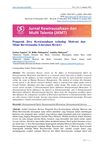 Farhan, Saputra and M., Ridho Mahaputra and Amalina, Maharani (2023) Pengaruh jiwa kewirausahaan terhadap motivasi dan minat berwirausaha (literature review). Jurnal Kewirausahan dan Multi Talenta, 1 (1): 4. pp. 42-53. ISSN 2964-6049