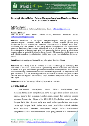 Roffi, Fatul Izzati and Andrian, Firdaus (2022) Strategi guru kelas dalam mengembangkan karakter siswa di SDIT Abata Lombok. Jurnal Pendidikan Guru Madrasah Ibtidaiyah Al-Amin, 1 (2): 6. pp. 132-138. ISSN 2986-0946