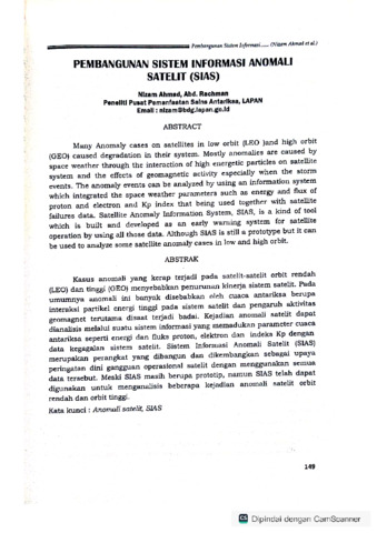 Kasus anomali yang kerap terjadi pada satelit-satelit orbit rcndah (LEO) dan tinggi (GEO) menyebabkan penurunan kinerja sistem satelit. Pada umumnya anomali ini banyak discbabkan oleh cuaca antariksa berupa interaksi partikel energi tinggi pada sistem satelit dan pengaruh aktivitas geomagnet terutama disaat terjadi badai. Kejadian anomali satelit dapat dianalisis melalui suatu sistem informasi yang memadukan parameter cuaca antariksa seperti energi dan fluks proton, elektron dan indeks Kp dengan data kegagalan sistem satelit. Sistem Informasi Anomali Satelit (SIAS) merupakan perangkat yang dibangun dan dikembangkan sebagai upayaperingatan dini gangguan operasional satelit dengan menggunakan semua data tersebut. Meski SIAS masih berupa prototip, namun SIAS telah dapat digunakan untuk menganolisis beberapa kejadian anomali satelit orbit rcndah dan orbit tinggi.