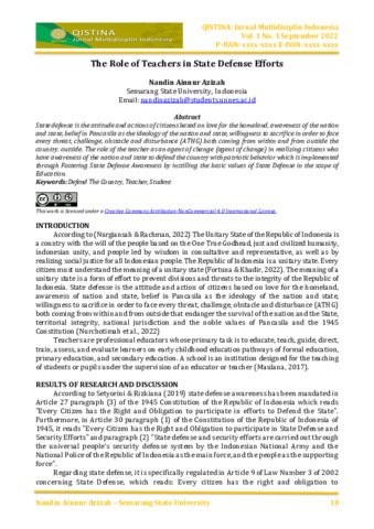 Nandin Ainnur, Azizah (2022) The role of teachers in state defense efforts. Qistina: Jurnal Multidisiplin Indonesia, 1 (1): 3. pp. 10-12. ISSN 2964-6278