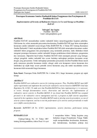 Indragini, Indragini and Sugino, Sugino (2017) Penerapan Keamanan Sumber Radioaktif dalam Penggunaan dan Penyimpanan di Pusdiklat-BATAN (Implementation of Security of Radioactive Sources in Use and Storage at Pusdiklat - BATAN). Widyanuklida, 16 (1). pp. 41-49. ISSN 1410-5357