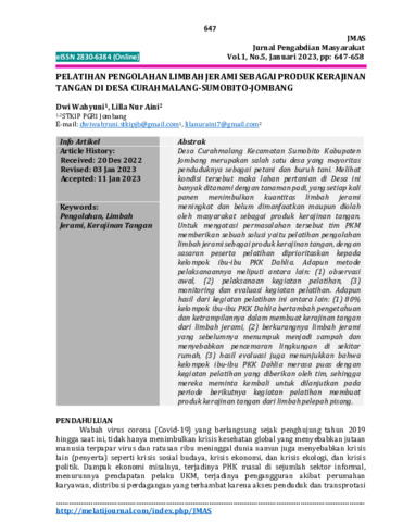 Wahyuni, Dwi and Aini, Lilla Nur (2023) Pelatihan pengolahan limbah jerami sebagai produk kerajinan tangan di Desa Curahmalang-Sumobito-Jombang. Jurnal Pengabdian Masyarakat (J-Mas), 1 (5): 9. pp. 647-658. ISSN 2830-6384