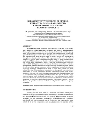 Mukh, Syaifudin (2006) RADIOPROTECTIVE EFFECTS OF GINSENG EXTRACT IN GAMMA-RAYS INDUCED CHROMOSOMAL DAMAGES OF HUMAN LYMPHOCYTE. Atom Indonesia, 34 (1). p. 45. ISSN 0126-1568