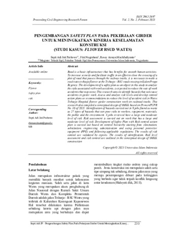 Septi, Adi Jati Prabowo and Fitri, Nugraheni and Rossy, Armyn Machfudiyanto (2023) Pengembangan safety plan pada pekerjaan girder untuk meningkatkan kinerja keselamatan konstruksi (Studi kasus: Flyover RSUD Wates). In: Proceeding Civil Engineering Research Forum.