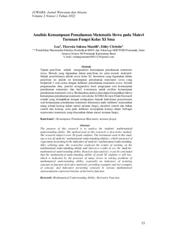 Lea, Lea and Theresia, Sukma Mantili and Etthy, Christin (2022) Analisis kemampuan pemahaman matematis siswa pada materi turunan fungsi Kelas XI SMA. JUWARA : Jurnal Wawasan dan Aksara, 2 (1): 2. pp. 15-24. ISSN 2797-2097