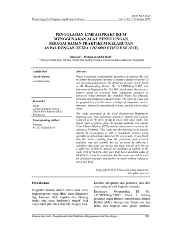 Sampah merupakan bahan hasil suatu kegiatan atau proses yang tidak dapat dimanfaatkan lagi dan dapat menimbulkan dampak negatif bagi masyarakat apabila tidak dikelola dengan baik. Pengertian sampah dapat ditemukan dalam Keputusan Menperindag RI Nomor 231/MPP/Kep/7/1997 dan Peraturan Pemerintah Nomor 18 Tahun 1999 yang menyatakan bahwa sampah adalah sisa barang atau bahan dari kegiatan atau proses produksi yang telah berubah fungsinya. Sampah mempunyai sifat fisik, kimia dan biologi. Jenis sampah dapat dikelompokkan berdasarkan sumber dan jenis senyawanya, seperti sampah rumah tangga, industri, pertanian, pertambangan, pariwisata, dan medis. Limbah yang dihasilkan di Lab Jalan Raya Jurusan Teknik Sipil, dari kegiatan praktikum, penelitian mahasiswa dan dosen berupa limbah cair dan limbah padat. Limbah cair tersebut berasal dari uji kelarutan aspal terhadap Tetra Chloro Ethylene (TCE) dan limbah uji ekstraksi yang merupakan pelarutnya adalah Pertamax. Limbah ini berpotensi untuk dimanfaatkan kembali, yaitu dengan dimurnikan kembali dengan proses penyulingan menggunakan alat yang dirancang khusus. Berdasarkan hasil pengujian diketahui bahwa limbah hasil kegiatan praktikum dan penelitian masih layak untuk digunakan atau digunakan kembali dengan menunjukkan nilai kelarutan yang tidak terlalu dominan yaitu hanya mempunyai selisih sebesar 0,01% yaitu kelarutan sebesar aspal pada limbah TCE sebesar 99,63% sedangkan TCE murni mempunyai nilai kelarutan sebesar 99,64%. Jadi dapat disimpulkan bahwa limbah ini masih dapat dimanfaatkan untuk kegiatan praktikum dan penelitian selanjutnya tanpa harus menggunakan TCE yang baru.