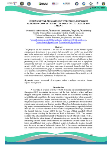 Primadi, Candra Susanto and Endah, Suci Damayanti and Supardi, Supardi and Kamsariaty, Kamsariaty (2023) Human capital management strategic: Employee retention concepts in hotel industry to create top talent. In: Proceeding Book The International Hospitality Entrepreneurship and Innovation Conference.