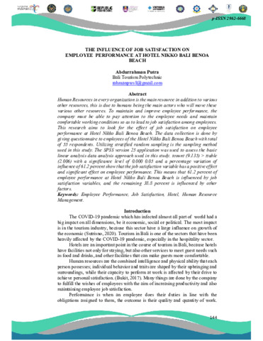 Human Resources in every organization is the main resource in addition to various other resources, this is due to humans being the main actors who will move these various other resources. To maintain and improve employee performance, the company must be able to pay attention to the employee needs and maintain comfortable working conditions so as to lead to job satisfaction among employees. This research aims to look for the effect of job satisfaction on employee performance at Hotel Nikko Bali Benoa Beach. The data collection is done by giving questionnaire to employees of the Hotel Nikko Bali Benoa Beach with total of 55 respondents. Utilizing stratified random sampling is the sampling method used in this study. The SPSS version 25 application was used to assess the basic linear analysis data analysis approach used in this study. tcount (9.135) > ttable (2.006) with a significance level of 0.000 0.05 and a percentage variation of influence of 61.2 percent show that the job satisfaction variable has a positive effect and significant effect on employee performance. This means that 61.2 percent of employee performance at Hotel Nikko Bali Benoa Beach is influenced by job satisfaction variables, and the remaining 38.8 percent is influenced by other factors.