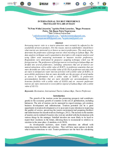 Ni Putu, Widia Listyorini and Aprisha, Firda Lestarien and Bagas, Pramasta Putra and Ida Bagus, Putra Negarayana (2023) International tourist preference travelled to Labuan Bajo. In: Proceeding Book The International Hospitality Entrepreneurship and Innovation Conference.