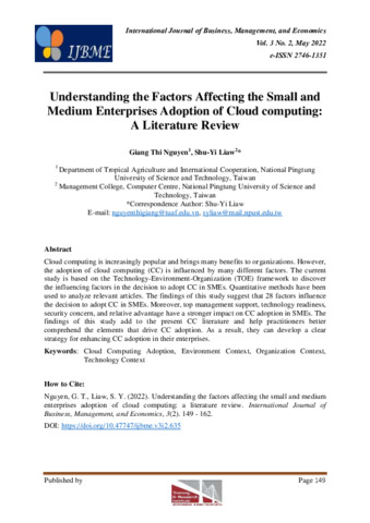 Giang Thi, Nguyen and Shu-Yi, Liaw (2022) Understanding the factors affecting the small and medium enterprises adoption of cloud computing: a literature review. International Journal of Business, Management, and Economics, 3 (2). pp. 149-162. ISSN 2746-1351