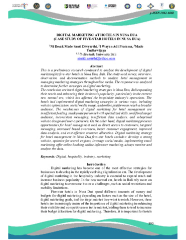 This is a preliminary research conducted to analyze the development of digital marketing by five-star hotels in Nusa Dua, Bali. The study used survey, interview, observation, and documentation methods to analyze hotel management in managing marketing strategies through online media. The response was analyzed to determine further strategies in digital marketing. The conclusion are hotel digital marketing strategies in Nusa Dua, Bali expanding their reach and enhancing their business's popularity, particularly in the current new normal era, which has affected the hospitality industry's operations. The hotels had implemented digital marketing strategies in various ways, including website optimization, social media usage, and online platforms to reach a broader audience. The weaknesses of digital marketing for hotel management are insufficient funding, inadequate personnel with specialized skills, undefined target audience, inconsistent messaging, insufficient data analysis, and suboptimal website design and user experience. On the other hand, digital marketing presents opportunities for hotel management such as direct access to customers, targeted messaging, increased brand awareness, better customer engagement, improved data analysis, and cost-effective resource allocation. Digital marketing strategy for hotel management in Nusa Dua five-star hotels includes: develop a strong website, optimize for search engines, leverage social media, implementing email marketing, offer online booking, utilize influencer marketing, always monitor and analyze the data.