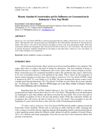 Gloria, Irene and Limanta, Liem Satya (2023) Beauty standard construction and its influence on consumerism in Indonesia’s Next Top Model. Kata Kita: Journal of Language, Literature, and Teaching, 11 (1): 13. pp. 104-113. ISSN 2598-7801