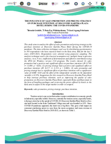 Brenda, Godeliv and I Putu, Esa Widaharthana and I Gusti, Agung Febrianto (2023) The influence of sales promotion and pricing strategy on purchase intention at discovery Kartika Plaza Hotel during the Covid-19 pandemic. In: Proceeding Book The International Hospitality Entrepreneurship and Innovation Conference.