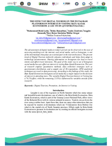 Muhammad, Rizki Lubis and Ikhlas, Ramadhan and Junita, Zendrato and Anggita, Damanik and Desy, Rotua Simbolon and Ridha, Siregar (2023) The effect of digital tourism on the Instagram platform on interest in visiting Batu Katak ecotourism (Case study @visitbatukatak. In: Proceeding Book The International Hospitality Entrepreneurship and Innovation Conference.