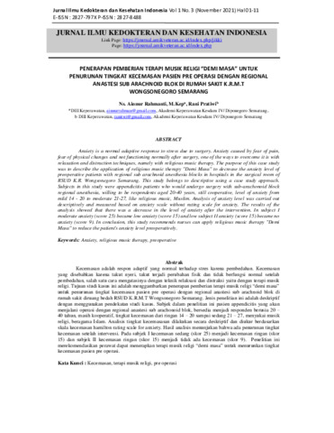 Ainnur, Rahmanti and Rani, Pratiwi (2021) Penerapan pemberian terapi musik religi “demi masa” Untuk penurunan tingkat kecemasan pasien pre operasi dengan regional anastesi sub arachnoid blok di rumah sakit K.R.M.T Wongsonegoro Semarang. Jurnal Ilmu Kedokteran dan Kesehatan Indonesia, 1 (3): 1. pp. 1-11. ISSN 2827-8488