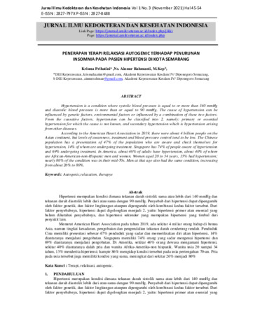 Krisma, Prihatini and Ainnur, Rahmanti (2021) Penerapan terapi relaksasi autogenic terhadap penurunan insomnia pada pasien hipertensi di kota Semarang. Jurnal Ilmu Kedokteran dan Kesehatan Indonesia, 1 (3): 4. pp. 45-54. ISSN 2827-8488