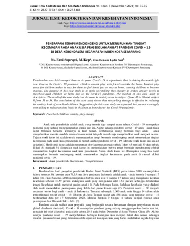 Erni, Suprapti and Rika Desiana Lydia, Sari (2021) Penerapan terapi mendongeng untuk menurunkan tingkat kecemasan pada anak usia prasekolah akibat pandemi covid – 19 di desa Kebondalem kecamatan Mijen kota Semarang. Jurnal Ilmu Kedokteran dan Kesehatan Indonesia, 1 (3): 5. pp. 55-65. ISSN 2827-8488