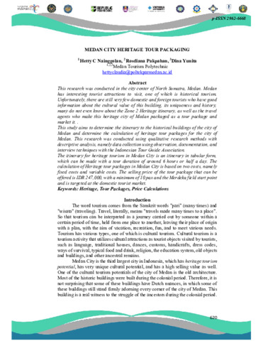 This research was conducted in the city center of North Sumatra, Medan. Medan has interesting tourist attractions to visit, one of which is historical tourism. Unfortunately, there are still very few domestic and foreign tourists who have good information about the cultural value of this building, its uniqueness and history, many do not even know about the Zone 2 Heritage itinerary, as well as the travel agents who make this heritage city of Medan packaged as a tour package and market it. . This study aims to determine the itinerary to the historical buildings of the city of Medan and determine the calculation of heritage tour packages for the city of Medan. This research was conducted using qualitative research methods with descriptive analysis, namely data collection using observation, documentation, and interview techniques with the Indonesian Tour Guide Association. The itinerary for heritage tourism in Medan City is an itinerary in tabular form, which can be made with a tour duration of around 6 hours or half a day. The calculation of Heritage tour packages in Medan City is based on two costs, namely fixed costs and variable costs. The selling price of the tour package that can be offered is IDR 247,000, with a minimum of 10 pax and the Merdeka field start point and is targeted at the domestic tourist market.