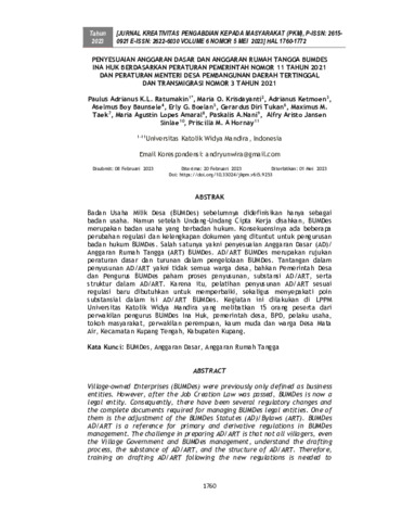 Ratumakin, Paulus Adrianus K.L. and Krisdayanti, Maria O. and Ketmoen, Adrianus and Baunsele, Aselmus Boy and Boelan, Erly G. and Tukan, Gerardus Diri and Taek, Maximus M. and Amaral, Maria Agustin Lopes and Nani, Paskalis A. and Sinlae, Alfry Aristo Jansen and Hornay, Priscilla M. A (2023) Penyesuaian anggaran dasar dan anggaran rumah tangga BUMDES INA HUK berdasarkan Peraturan Pemerintah Nomor 11 Tahun 2021 dan Peraturan Menteri Desa Pembangunan Daerah Tertinggal dan Transmigrasi Nomor 3 Tahun 2021. Jurnal Kreativitas Pengabdian kepada Masyarakat, 6 (5): 6. pp. 1760-1772. ISSN 2615-0921