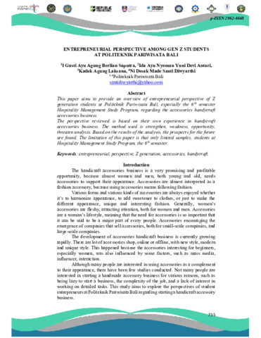 I Gusti, Ayu Agung Berlian Saputra and Ida Ayu, Nyoman Yuni Devi Antari and Kadek, Agung Laksana and Ni Desak, Made Santi Diwyarthi (2023) Entrepreneurial perspective among gen Z students at Bali Tourism Polytechnic. In: Proceeding Book The International Hospitality Entrepreneurship and Innovation Conference.