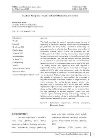 Mochamad, Alfan (2022) Teachers’ perception toward the role of instructional supervisor. Tarlim: Jurnal Pendidikan Agama Islam, 5 (1): 1. pp. 1-13. ISSN 2615-7225