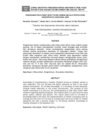 Sitompul, Monalisa and Haro, Masta and Malinti, Evelin and Wulandari, Imanuel Sri Mei (2023) Pemahaman pola hidup sehat di era endemi melalui penyuluhan kesehatan di Labschool UNAI. Jurnal Kreativitas Pengabdian kepada Masyarakat, 6 (5): 9. pp. 1788-1790. ISSN 2615-0921