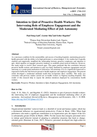 Paul, Dung Gadi and Gontur, Silas and Esther, Bagobiri (2022) Intention to quit of proactive health workers: the intervening role of employee engagement and the moderated mediating effect of job autonomy. International Journal of Business, Management and Economics, 3 (1). pp. 1-23. ISSN 2746-1351