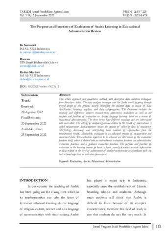 Iis, Susiawati and Raswan, Raswan and Dadan, Mardani (2022) The purpose and functions of evaluation of Arabic learning in educational administration review. Tarlim: Jurnal Pendidikan Agama Islam, 5 (2): 1. pp. 115-126. ISSN 2615-7225