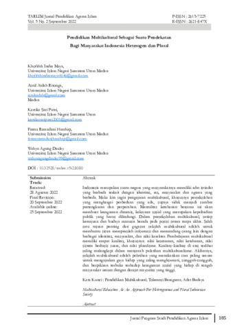Khofifah Indra, Maya and Asnil Aidah, Ritonga and Kartika Sari, Putri and Fatma Ramadani, Harahap and Wahyu Agung, Daulay (2022) Pendidikan multikultural sebagai suatu pendekatan bagi masyarakat Indonesia heterogen dan plural. Tarlim: Jurnal Pendidikan Agama Islam, 5 (2): 6. pp. 185-196. ISSN 2615-7225