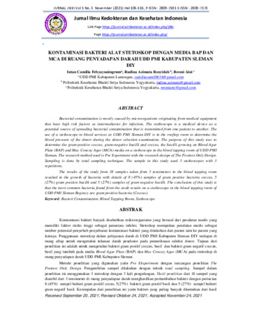 Intan Camilia, Febyayuningrum and Rudina Azimata, Rosyidah and Resmi, Aini (2021) Kontaminasi bakteri alat stetoskop dengan media BAP dan MCA di ruang penyadapan darah UDD PMI kabupaten Sleman DIY. Jurnal Ilmu Kedokteran dan Kesehatan Indonesia, 1 (3): 11. pp. 106-116. ISSN 2827-8488