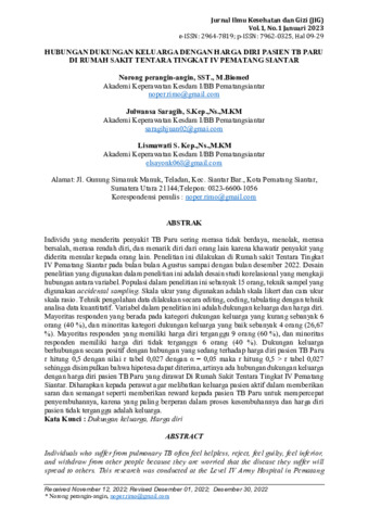 Norong, perangin-angin and Julwansa, Saragih and Lismawati, Lismawati (2023) Hubungan dukungan keluarga dengan harga diri pasien TB paru di rumah sakit Tentara tingkat IV Pematang Siantar. Jurnal Ilmu Kesehatan dan Gizi, 1 (1): 2. pp. 9-29. ISSN 2962-0325