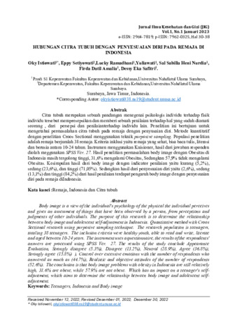 Oky, Istiowati and Eppy, Setiyowati and Lucky, Ramadhani and Yuliawati, Yuliawati and Sal Sabilla Heni, Nurdia and Firda Datil, Amalia and Dessy Eka, Safitri (2023) Hubungan citra tubuh dengan penyesuaian diri pada remaja di Indonesia. Jurnal Ilmu Kesehatan dan Gizi, 1 (1): 3. pp. 30-38. ISSN 2962-0325