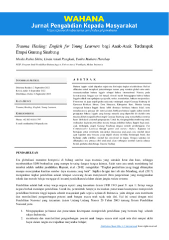 Meida Rabia, Sihite and Linda Astuti, Rangkuti and Yunita Mutiara, Harahap (2022) Trauma healing: english for young learners bagi anak-anak terdampak erupsi Gunung Sinabung. Wahana Jurnal Pengabdian kepada Masyarakat, 1 (2): 1. pp. 30-36. ISSN 2962-7931