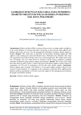 Datin, Suhailah and Yesi, Hasneli N and Herlina, Herlina (2023) Gambaran dukungan keluarga pada penderita diabetes melitus di wilayah kerja Puskesmas Sail Kota Pekanbaru. Jurnal Ilmu Kesehatan dan Gizi, 1 (1): 6. pp. 55-70. ISSN 2962-0325