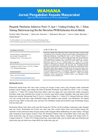 Perkawinan adalah ikatan lahir batin antara seorang pria dengan seorang wanita yang bertujuan untuk membentuk keluarga (rumah Tangga) yang bahagia dan kekal berdasarkan Ketuhanan Yang Maha Esa, Pasal 1 Ayat (1) Undang-Undang No. 1 Tahun 1974 tentang Perkawinan. Bahwa salah satu tujuan dari suatu perkawinan adalah mempunyai keturunan (anak) yang dilahirkan dari seorang istri. Persolan yang timbul tentang kedudukan anak yang ibunya hamil duluan baru menikah. Berdasarkan Pasal 55 Ayat (1), Undang-Undang No. 1 Tahun 1974, Tentang Perkawinan. Bahwa bukti seorang anak yang sah hanya bisa dibuktikan dengan akta kelahiran yang berhubungan dengan ayah dari pada anak. Pengabdian Kepada Masyarakat ini dilaksanakan di Kelurahan Kwala Bekala Kecamatan Medan Johor Kota Medan. Mitra dalam kegiatan ini adalah ibu-ibu Persatuan Wirit Batak Islam (PWBI),yang dilaksanakan oleh Dosen / staf pengajar serta melibatkan mahasiswa/i Universitas Muslim Nusantara Al Washliyah. Pelaksanaan kegiatan ini berupa sosialisasi, tentang Pasal 55 Ayat (1) Undang-Undang No. 1 Tahun 1974 tentang Perkawinan, diskusi interaktif dan konsultasi hukum, yang diharapkan dapat menambah wawasan tentang hukum.