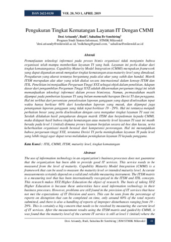 Desi, Arisandy and Rudi, Rudi and Salsalina, Br Sembiring (2019) Pengukuran tingkat kematangan layanan IT dengan CMMI. Jurnal Sifo Mikroskil, 20 (1): 5. pp. 41-50. ISSN 2622-8130