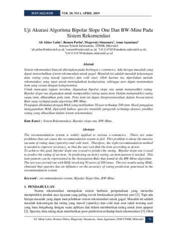 Sistem rekomendasi banyak diterapkan pada berbagai e-commerce. Ada berapa masalah yang dapat menyebabkan sistem rekomendasi untuk gagal. Masalah ini adalah masalah kekosongan data rating yang massif (sparsity) dan cold start. Oleh karena itu, diperlukan metode rekomendasi yang tepat untuk meningkatkan keakurasian, sehingga user dapat menemukan item yang sesuai dengan keinginannya.