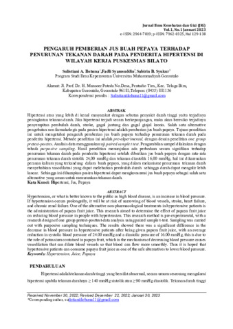 Sulistiani A., Ilohuna and Fadli, Syamsuddin and Sabirin B., Syukur (2023) Pengaruh pemberian jus buah pepaya terhadap penurunan tekanan darah pada penderita hipertensi di wilayah kerja Puskesmas Bilato. Jurnal Ilmu Kesehatan dan Gizi, 1 (1): 12. pp. 129-138. ISSN 2962-0325